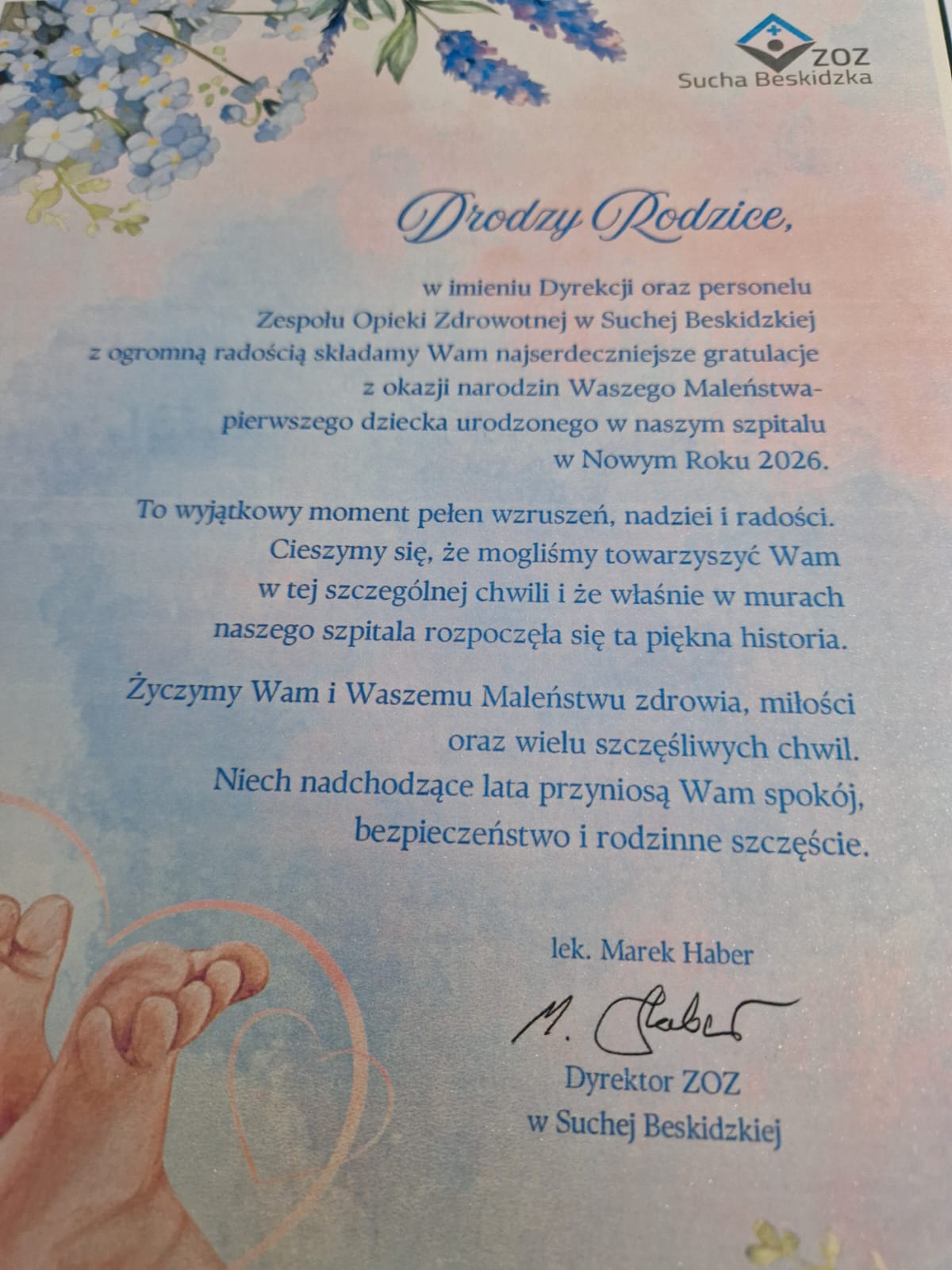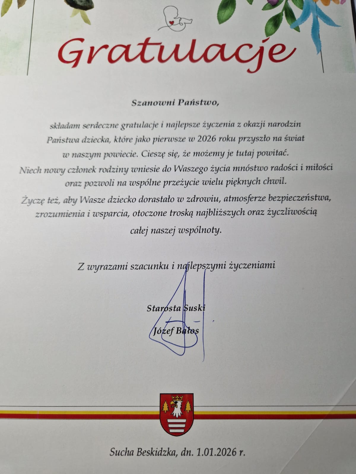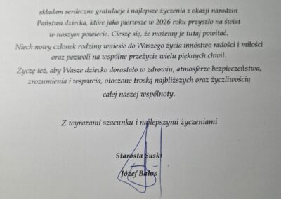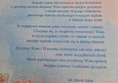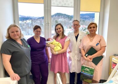W imieniu samorządu gratulacje wraz z prezentem przekazał Starosta Suski Pan Józef Bałos, a także Dyrekcja naszego szpitala, wręczając upominki w postaci voucherów na zakup niezbędnych rzeczy do pielęgnacji maluszka.